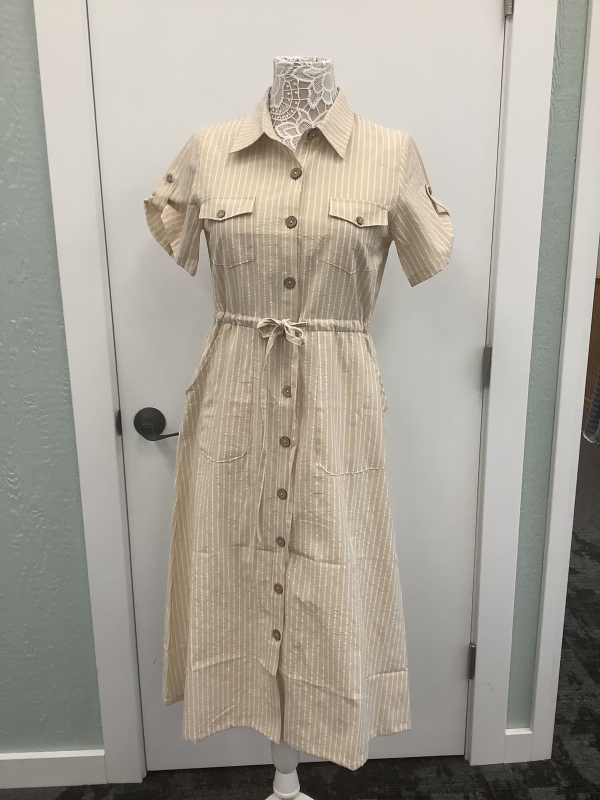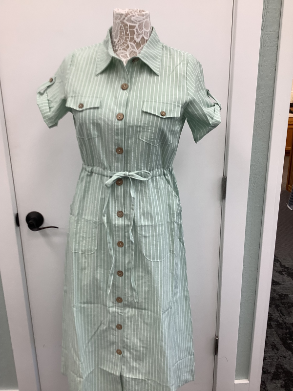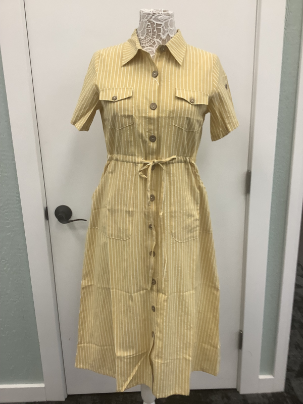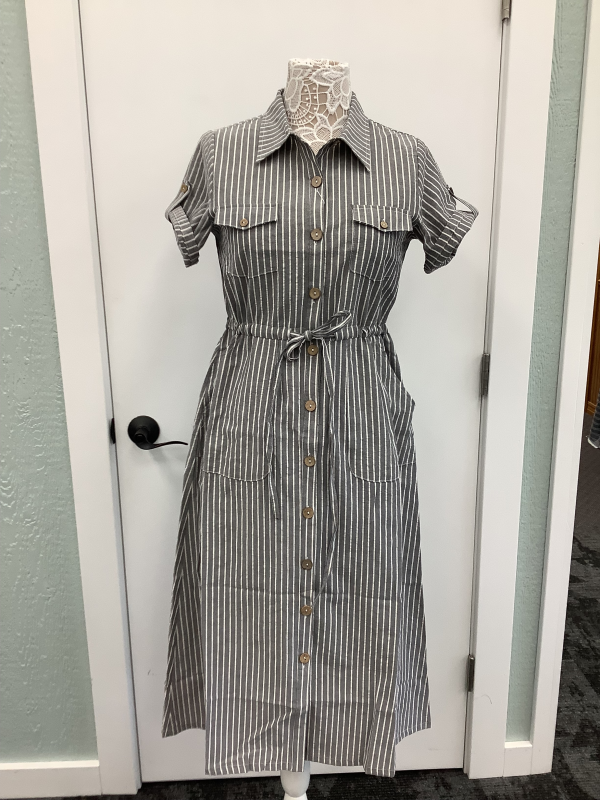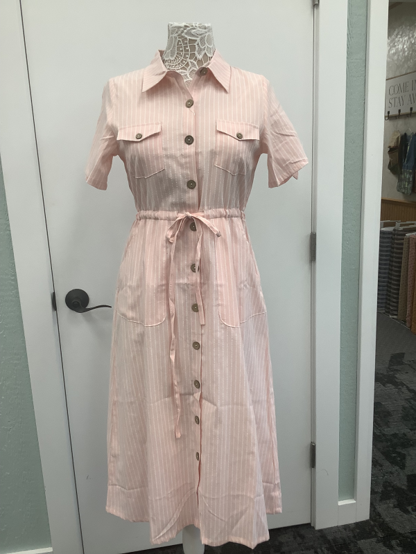 This classic button-front shirt dress combines vintage charm with everyday comfort. Features a tailored fit with functional chest pockets, a decorative drawstring waist belt, and a flattering A-line silhouette. The crisp pinstripe pattern adds timeless elegance, while the short sleeves make it perfect for any season. Ideal for casual outings, work, or special occasions. Available in eight beautiful colors to match any style preference. Made with quality craftsmanship and ready to wear.