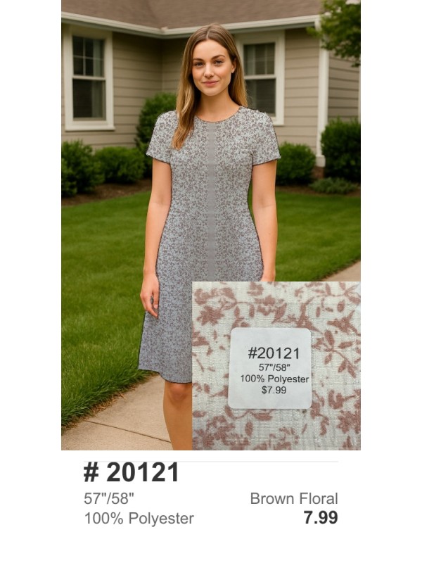 20121This fabric is a gray and white floral print made of 100% polyester. It has a subtle, textured pattern and appears to be lightweight and suitable for clothing or home decor applications.