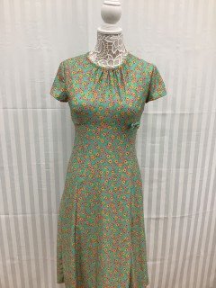 The image showcases the dress on a mannequin, highlighting its colorful floral pattern and flattering cut. The combination of bright colors and a classic design makes this dress a versatile addition to any young girl's wardrobe. Ideal for family gatherings, parties, or casual summer days, this Green Girls Dress in size 12 offers both comfort and style.